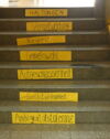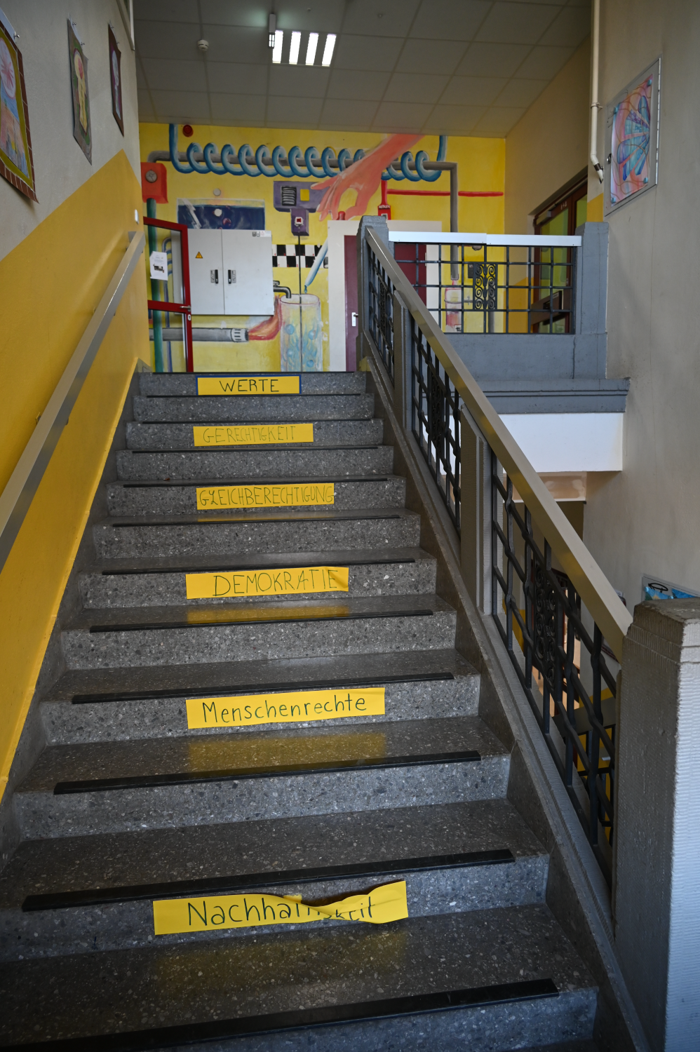 Schon beim Eintritt in das Schulgebäude werden die Besucher freundlich begrüßt und mit Namensschild versehen. Bereits das Treppenhaus weist auf die Grundbegriffe demokratischer Kultur hin. Ehemalige (prominente) Schülerinnen und Schüler sehen ihre ehemalige Schule nochmals neu - und werden in ihren heutigen Positionen gesehen, z. B. Politiker Uwe Becker.