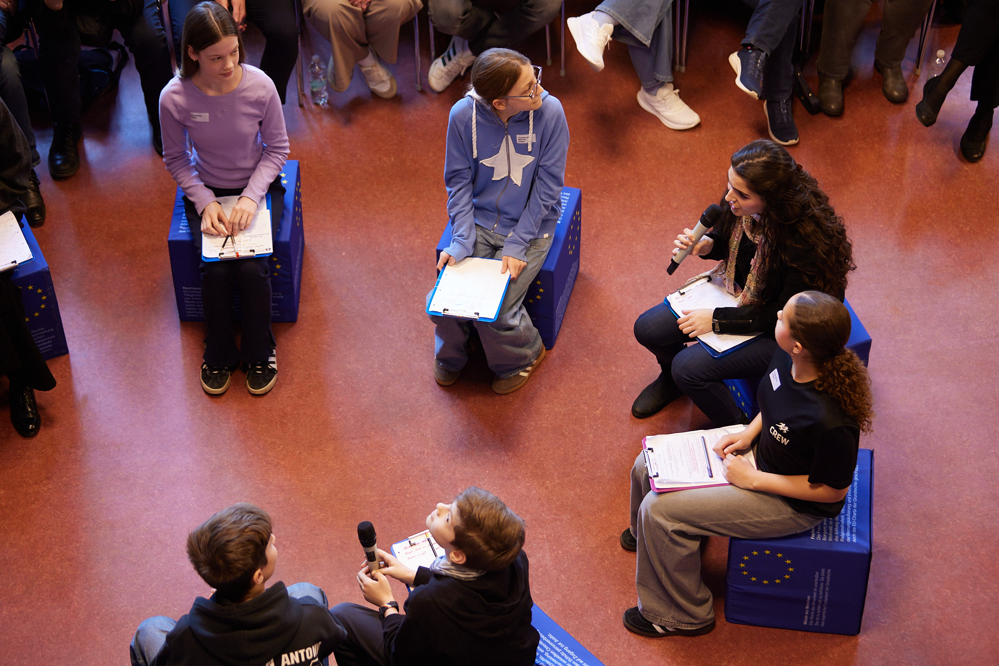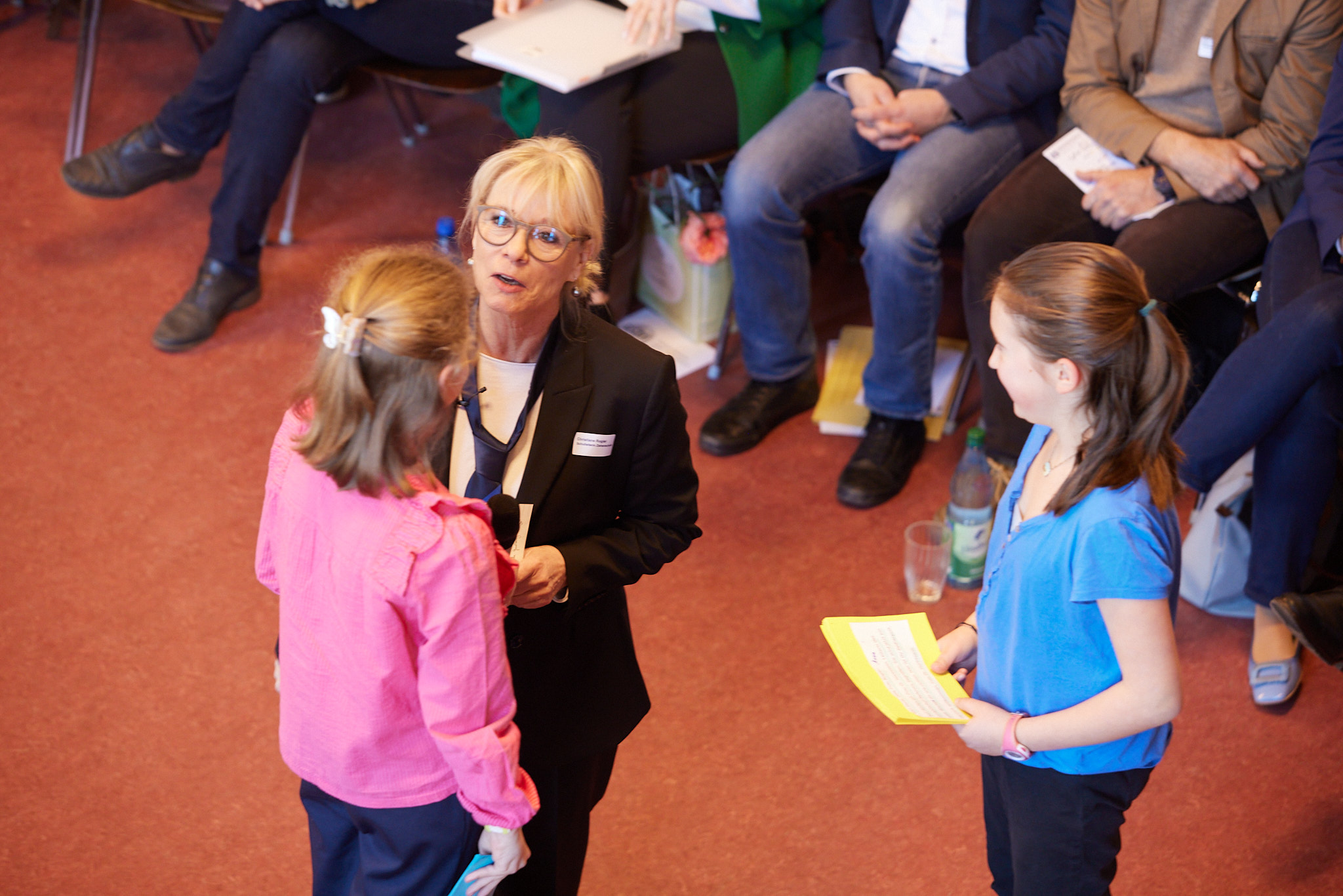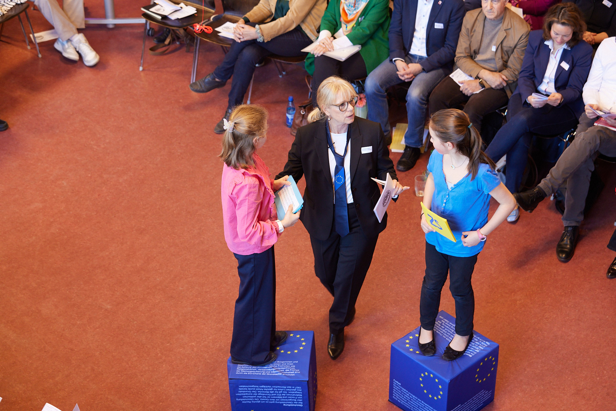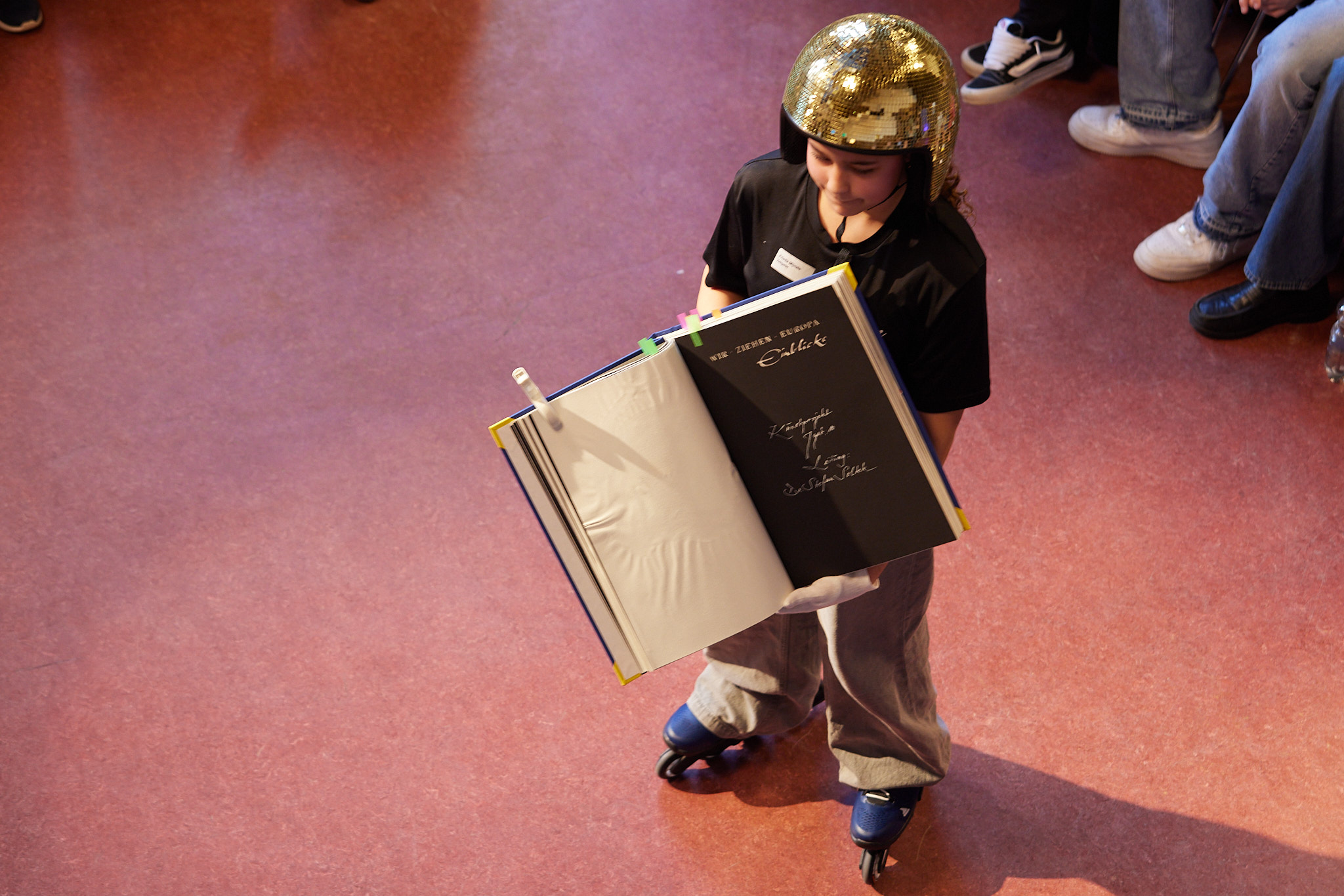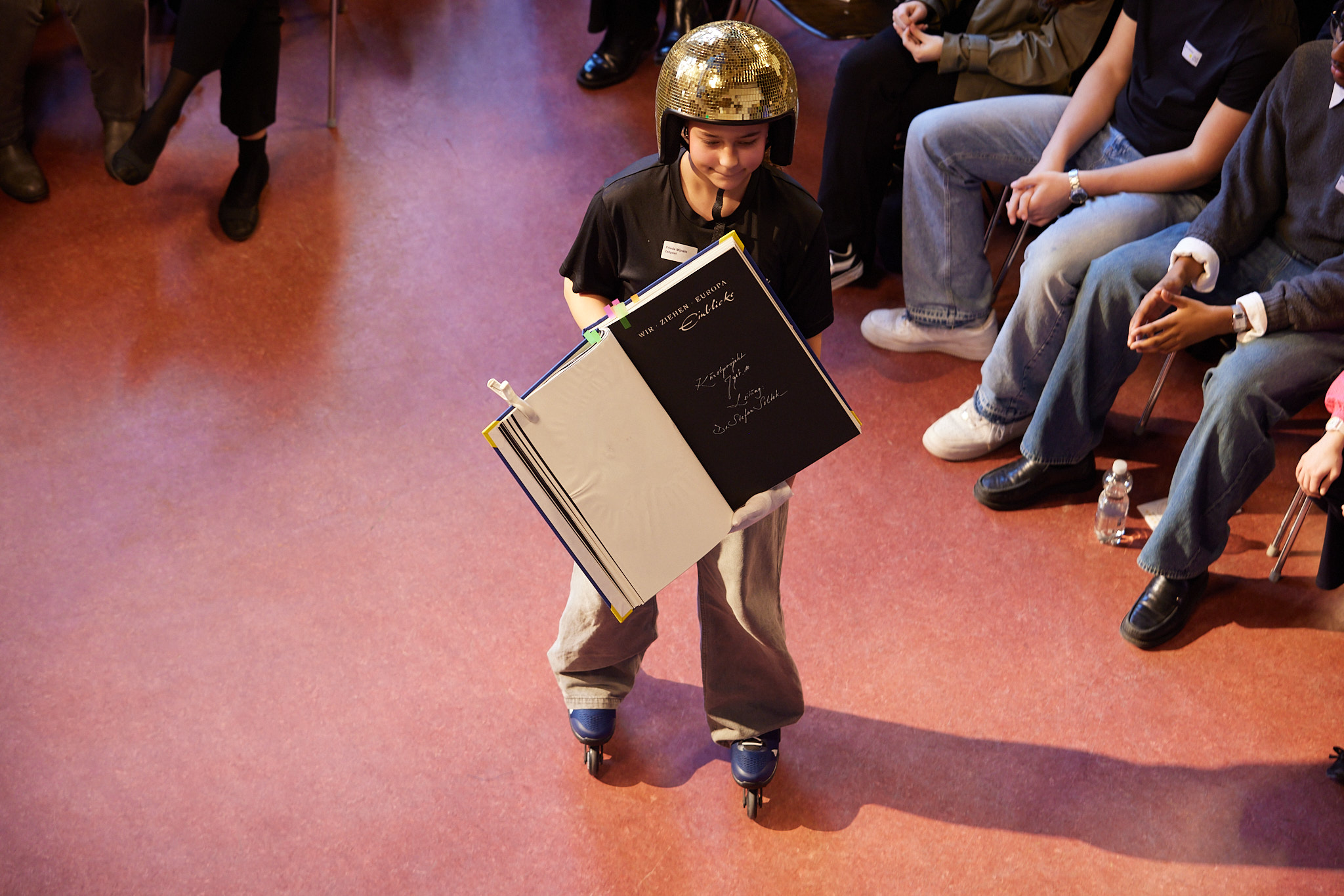 Die ganze Schule ist auf den Beinen. In der Aula versammeln sich nach und nach aktive und ehemalige Schülerinnen und Schüler, Lehrkräfte, Eltern, Schulleitung sowie die zahlreichen Gäste aus Politik, Schulgemeinde, Bildungsverwaltung, Partnerschulen und Europaschulen. Hier treffen sich alte Bekannte, Weggefährten und Kooperationspartner. Die Festgemeinde nimmt ganz im Sinne der demokratischen und lernenden Institution in kreisförmiger Anordnung Platz: Kommunikationskultur statt Redenmarathon.