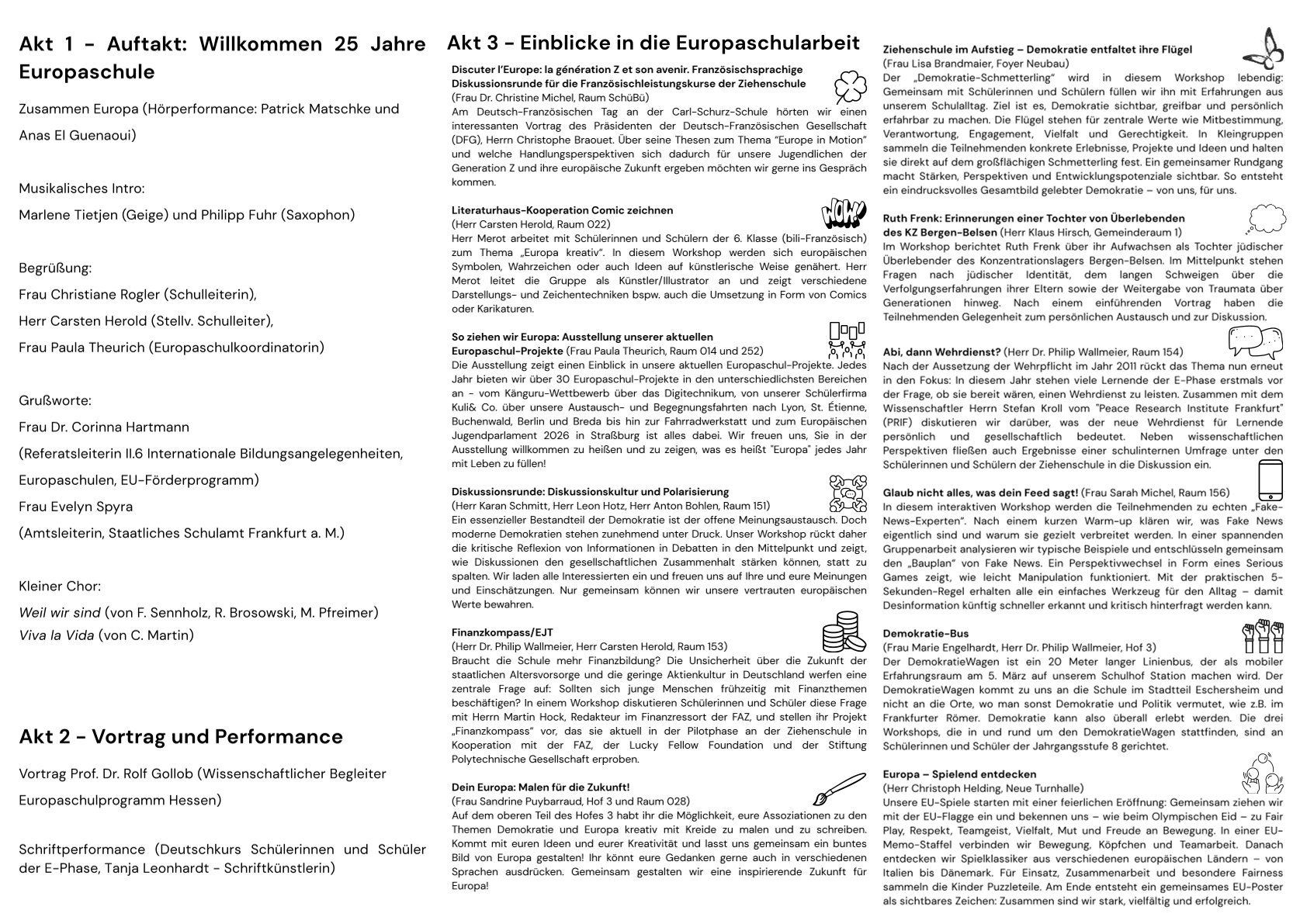 Es folgt ein mehrstündiges, höchst abwechslungsreiches Programm in fünf Akten: Grußworte, Performance, Festvortrag, Workshops, Kunst, Theater, Musik und viel Gelegenheit zum gegenseitigen Austausch; viel Gelegenheit, um in das quicklebendige Europaschulleben einzutauchen und für diese Zeit Teil des Geschehens zu sein; viel Gelegenheit, die Ziehenschule in ihrem gesamten System einschließlich ihrer Netzwerke erleben zu können; viel Gelegenheit, um den Blick auf Details dieser Europaschule und ihres Festtags werfen zu können: